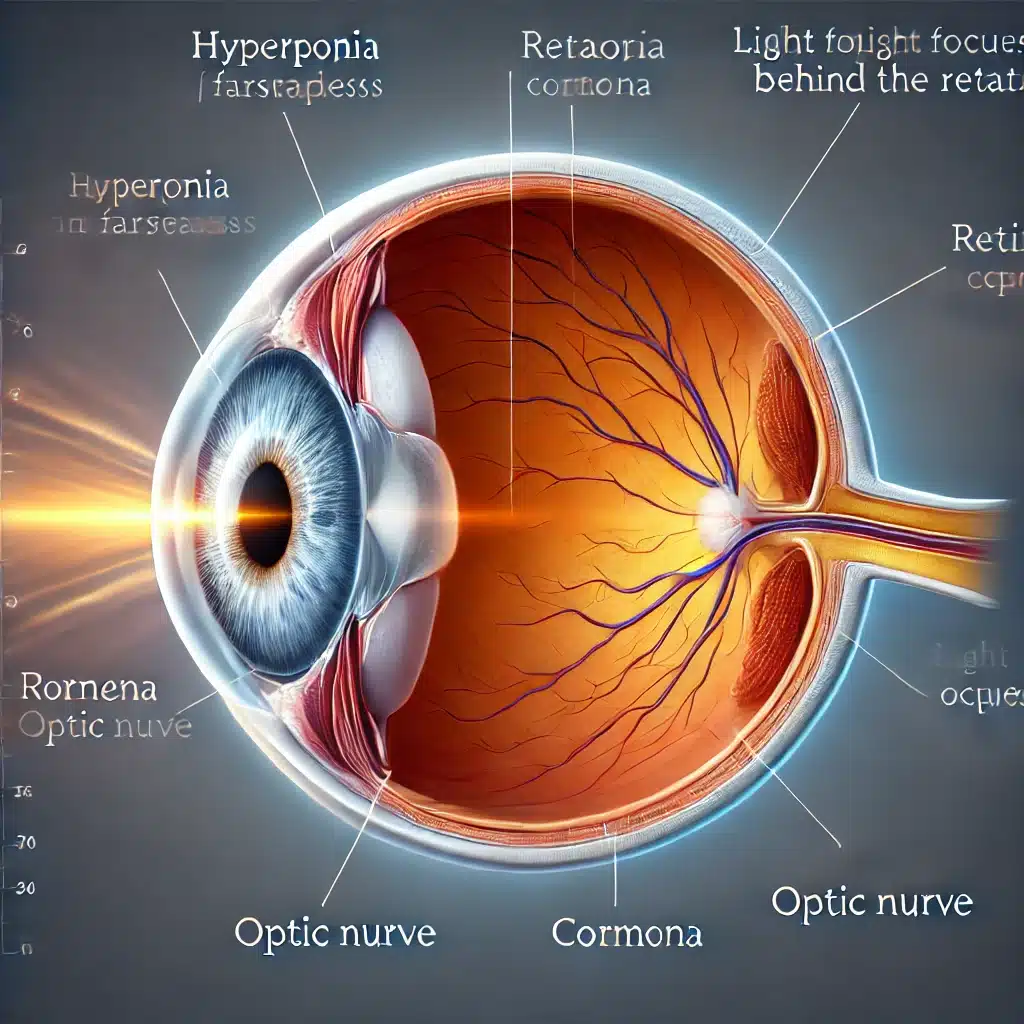ליקוי זה נובע לרוב מגלגל עין קצר או קרנית שאינה קמורה מספיק. במצב זה, קרני האור אינן ממוקדות כראוי על הרשתית, אלא מאחוריה.
