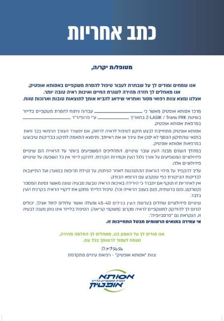 תוצאות הטיפול – שעות ספורות לאחר הניתוח, רוב המטופלים יכולים לראות היטב. למידע נוסף אודות הנחיות הטיפול לאחר הניתוח >>